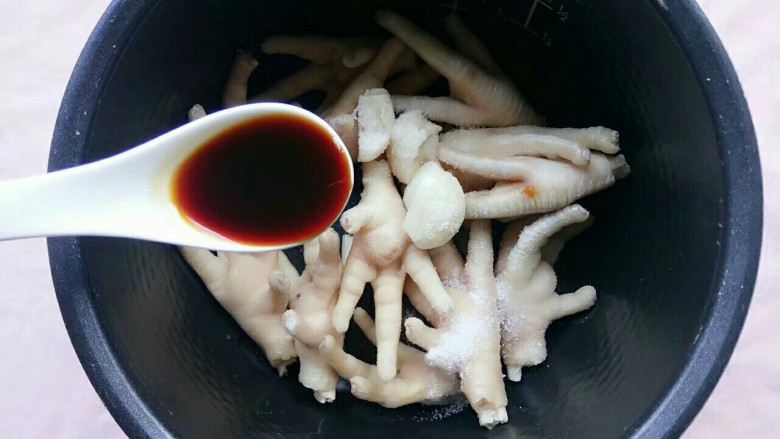 10. 加好盐和酱油后加入水,水平敷过凤爪即可,然后搅拌几下