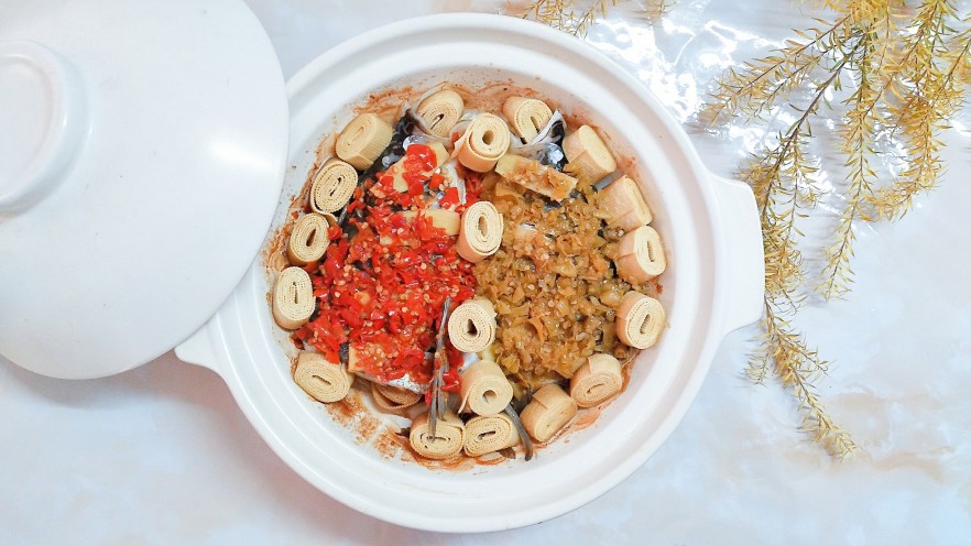 12. 把调好味的剁辣椒和野山椒分别倒入鱼头的两边!