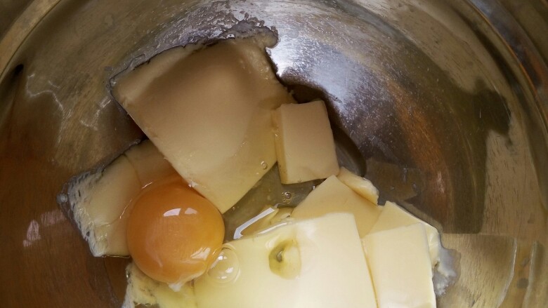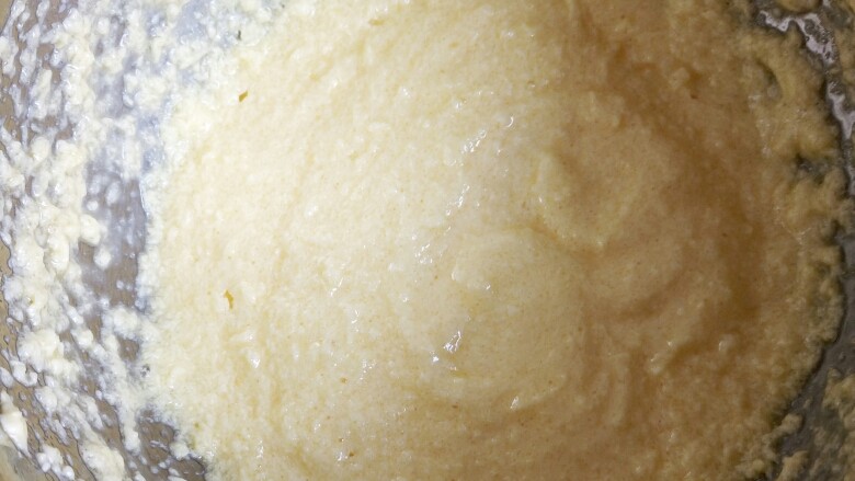 5. 在软化的黄油中分两次打入鸡蛋用电动打蛋器低速混这时候一定会水油分离 这个不用考虑 不影响成品