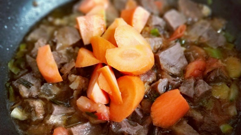 13. 再加入切好的胡萝卜,加入适量生抽调色,8-10分钟即可出锅。