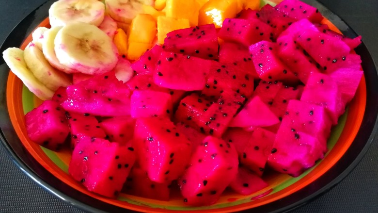 红心火龙果,海南小芒果,香蕉加上鲜牛奶,既饱了口福又饱了眼福,既营养丰富,又是一次视觉的盛宴。