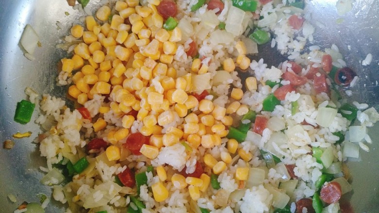 10. 米饭均匀的搅散,加入玉米粒翻炒均匀。