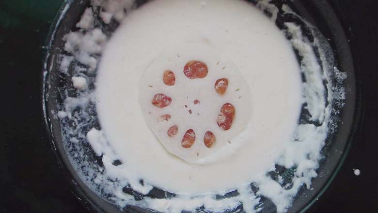 10. 将做好的藕夹放在面糊中,均匀裹上一层面糊