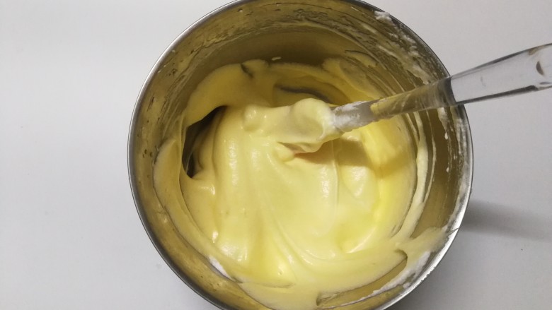 6. 取一大勺蛋白霜,与蛋黄糊混合