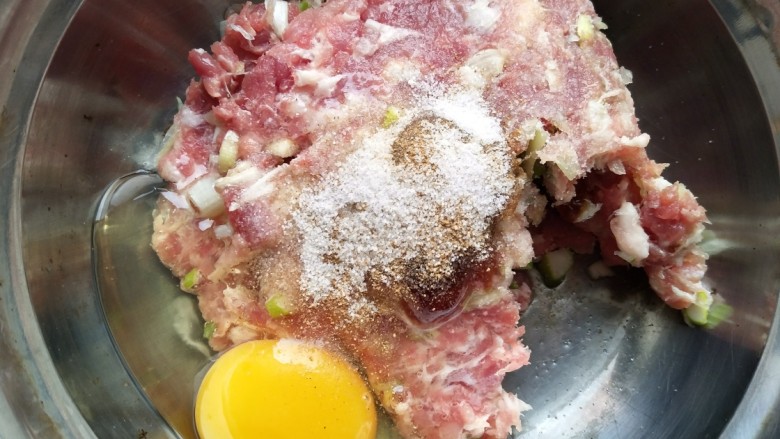 7. 肉馅放入葱,姜,耗油,食盐,十三香和打入一个鸡蛋,搅拌均匀。
