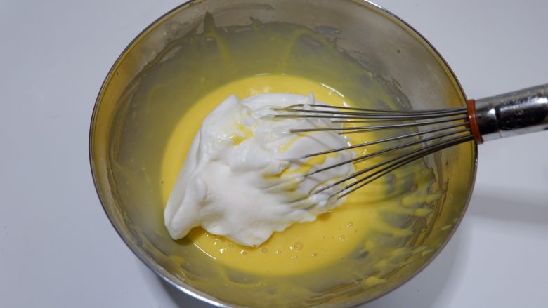 11. 先取1/3蛋白加入奶酪糊中,翻拌均匀。