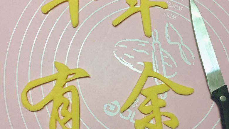 8. 然后取黄色面团擀成1cm厚的面片,用美工刀轻轻地刻写出“年 年 有 余”4个字。