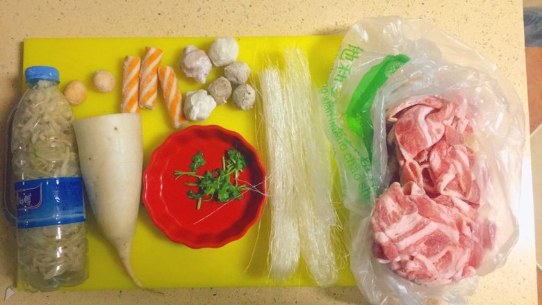5. 准备一个砂锅,放足够多的水,水要开的时候,把丸子们,下锅。我准备的有鱼丸,蟹肉棒,墨鱼丸,贡丸,是超市买的那种现成的。我们也可以自己做,就是比较麻烦一些。