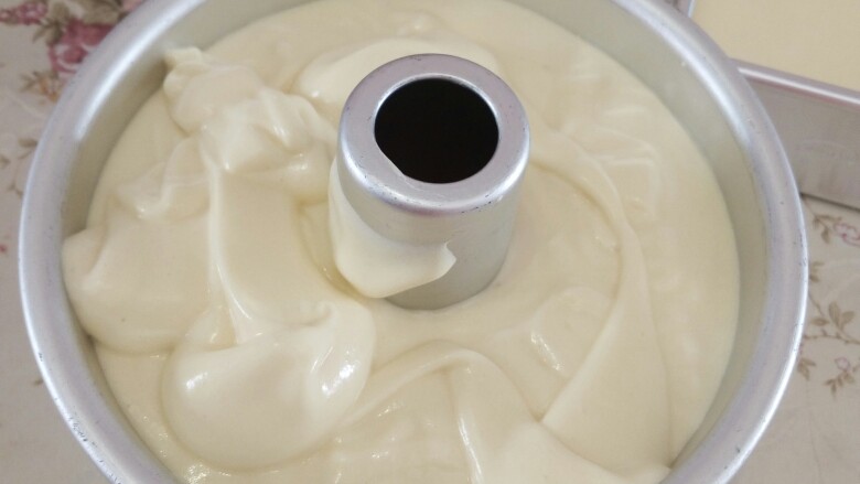 19. 把拌好的蛋糕糊倒入模具 垂直桌面震几下 排除大气泡 不要反复去震 状态好的蛋糕糊是震不出多少气泡的 如果每次都能震出很多气泡说明蛋白的步骤不对 消泡导致的