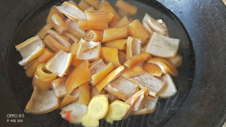 3. 猪皮用热水泡软(买的时候叫店家烧了一下,烧掉皮上的毛)