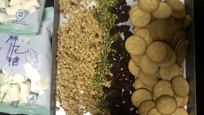 2. 把坚果,蔓越莓,卡乐比麦片还有饼干放在不粘烤盘里混合均匀。