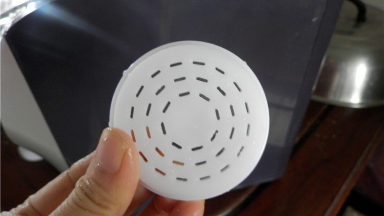 9. 盖上盖子,按“开/关”键(面条机开始工作)。待搅拌转动后,用清水量杯量150ML车前草汁,从顶盖右边槽口缓慢倒入(1个鸡蛋+水的混 合液是160ML)。