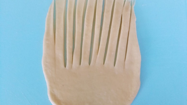 13. 从第一个面团开始,拿出来排气,擀成长方形,最下面擀薄一点,如图所示