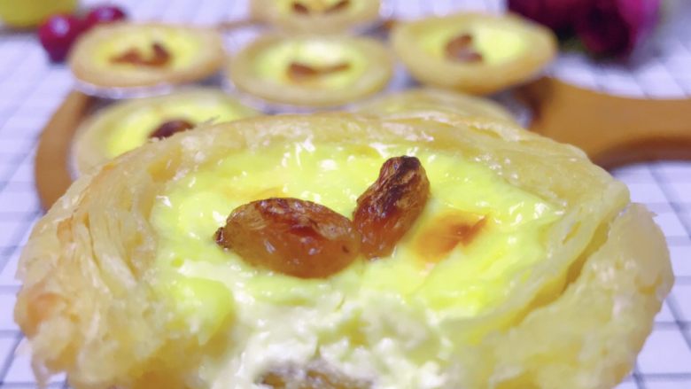 16. 这个时候蛋挞已基本成熟,上面放两颗泡好的葡萄干,继续烤5分钟