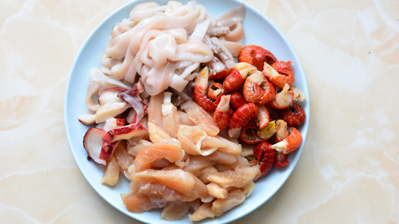 3. 鸡胸肉龙虾尾清理干净切成小块,鱿鱼洗净去除内脏,切成鱿鱼