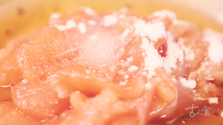 5. 醋,老抽,料酒,白糖和淀粉调成汁,入热锅,加鲜汤1匙,细盐、烧沸,放鸡片,均匀裹汁后盛出;