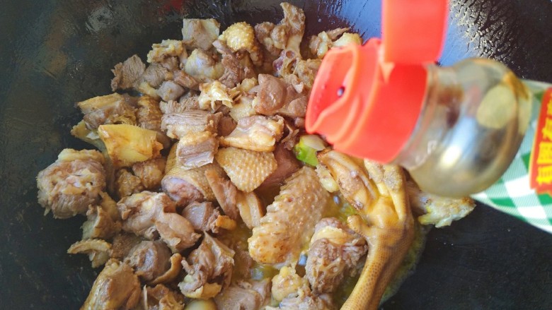 3. 锅里入油放入葱姜爆香,接着放入鹅肉大火翻炒