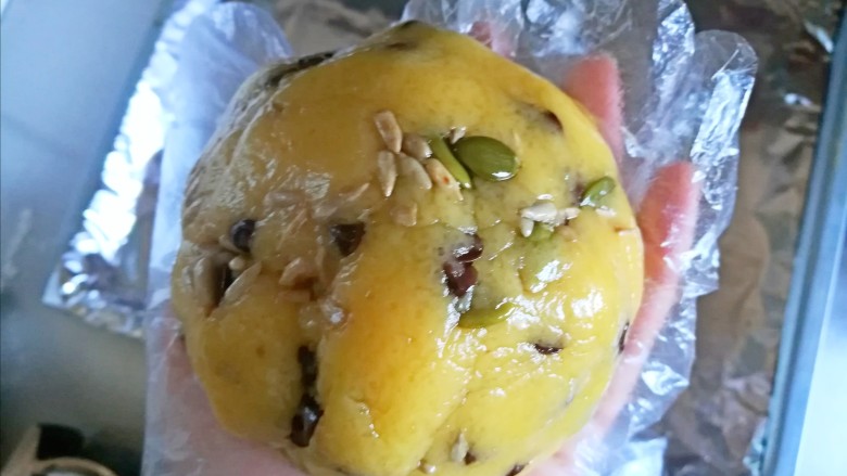 9. 带上一次性手套,将果仁和巧克力豆捏到一起,尽量不要揉哈。
