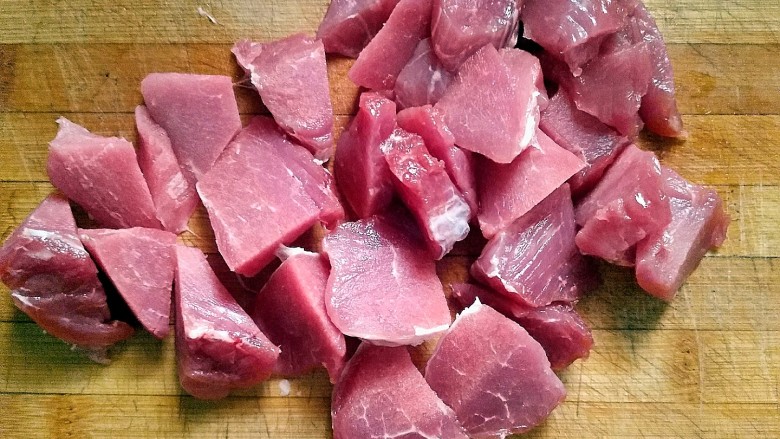 2. 按自己喜欢的口感把里脊肉切成块。想要酥脆就小块,想要细嫩就切大一点。