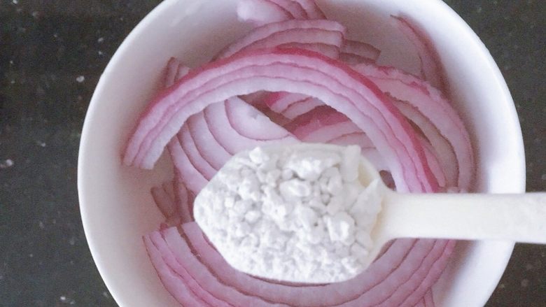 3. 洋葱切成丝后加一勺淀粉腌制一下