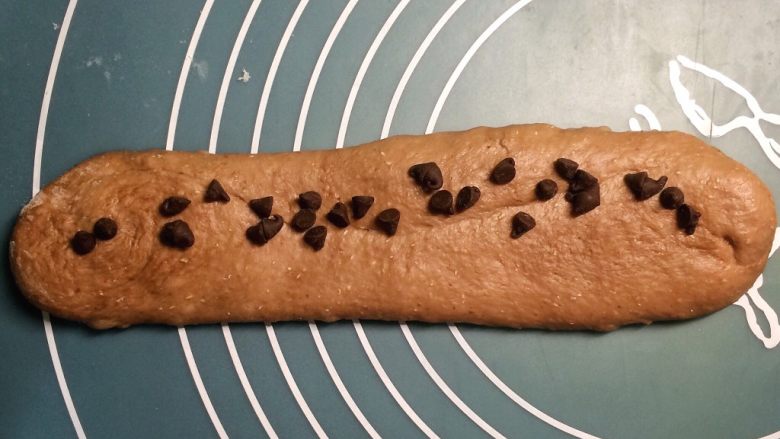7. 白面团直接卷成长条棍状。巧克力面团铺上巧克力豆,慢慢卷起。
