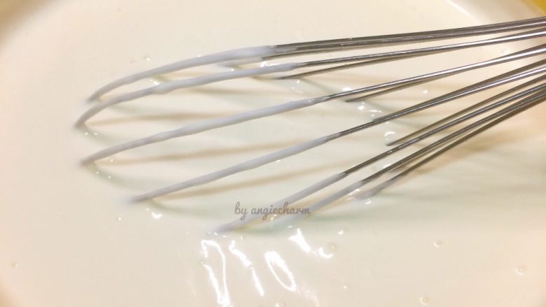 5. 隔水加热或者微波炉加热70g椰浆,温热约50度时离火,放入挤干水分的吉利丁片,搅拌至完全溶解,倒入慕斯糊中搅拌均匀。