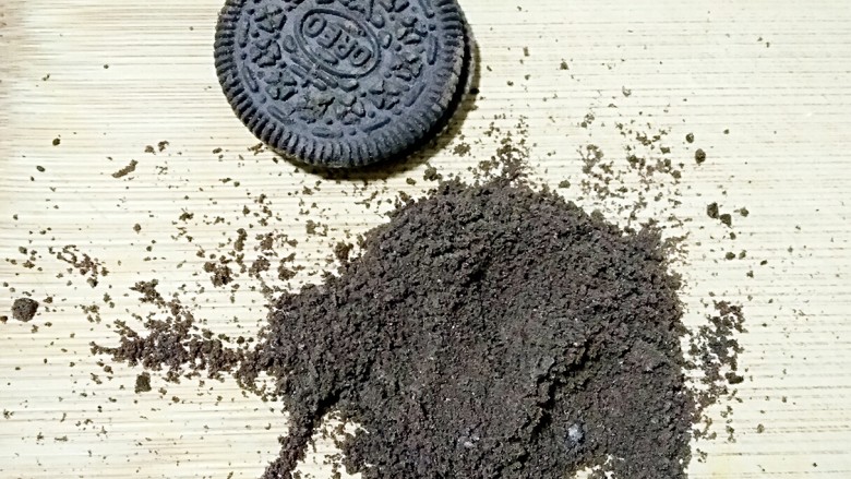 5. 取两片奥利奥,其中一片去掉夹心,用擀面杖擀成奥利奥碎。(万能的擀面杖啊!)另一片备用。