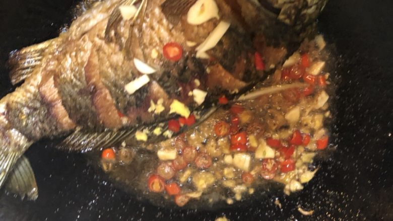 6. 加水莫过鱼背,加入生抽,老抽,味精,盖锅烧,中途翻次面,确保鱼两面入味