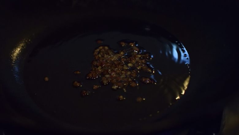 7. 趁花椒和豆瓣酱还未变焦时,转大火,倒入鸡脆骨。