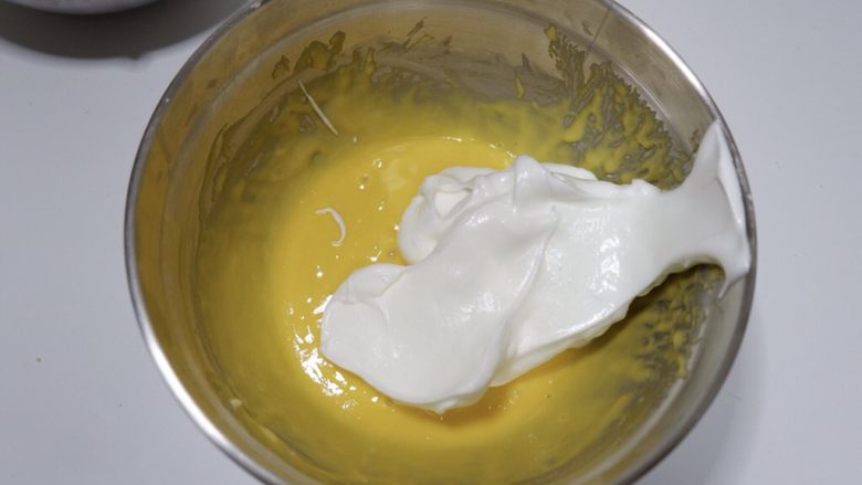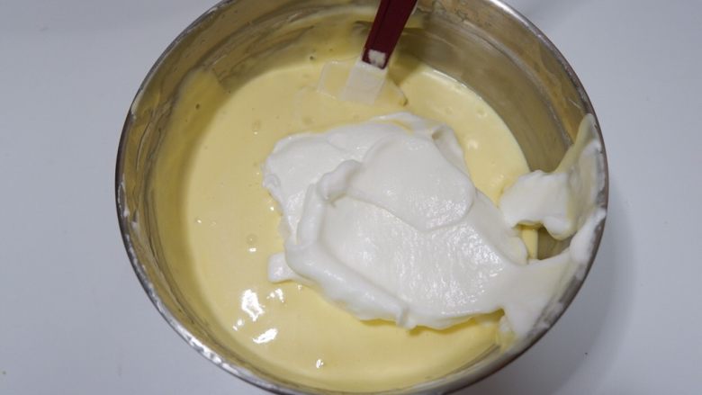 18. 分三次将蛋白加入蛋糕糊中,先取1/3蛋白加入蛋糕糊中,搅拌至完全融合