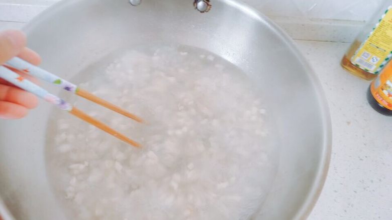 18. 锅里油热七分的时候倒肉丁,迅速翻炒。