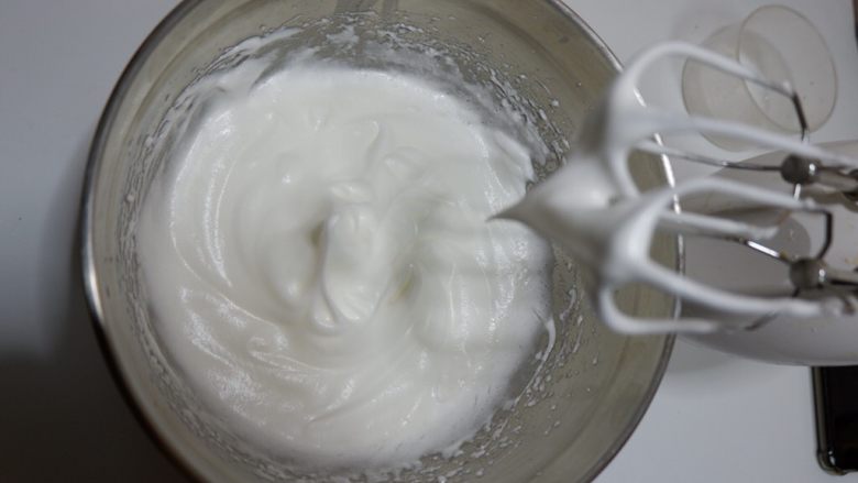 12. 蛋白中加入几滴柠檬汁,1g盐,分三次加入砂糖,将蛋白打发至湿性发泡。 最后记得转中速旋转蛋盆打发一下蛋白,起到稳定细腻蛋白的作用。要想成品的蛋糕胚细腻这一步非常关键哦