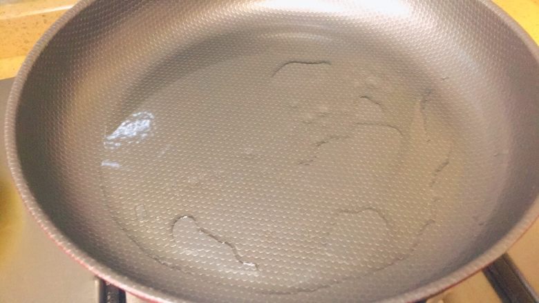12. 油热5分下蛋液,并马上把蛋液摇晃均匀平铺于锅底,火开中小火,慢慢煎,一定不要大了。差不多成型了之后。