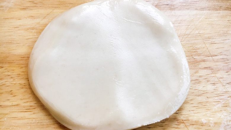 7. 最后借助擀面杖,从中间往外轻轻的擀,翻面后还是重复以前动作,用擀面杖从中间往外擀。这样反复几次饼就擀成了,饼的大小和6寸盘子大小差不多。