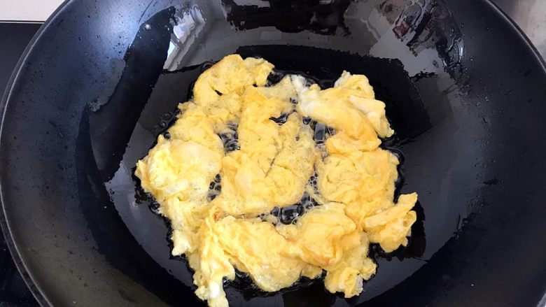 7. 油热了,将鸡蛋液倒入锅中,炒成块,不要炒太老,也就是3~5秒钟就赶紧出锅,不然鸡蛋会发硬口感不好。