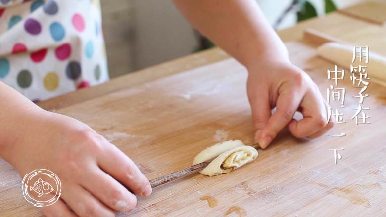 14. 用筷子在中间压一下,稍微抻长一点,绕着手指卷一下,底部捏上,很简单吧~