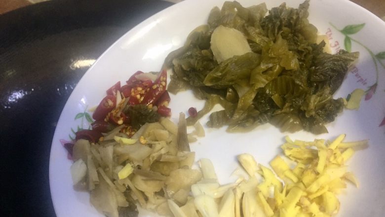 8. 七成热时将蒜姜泡椒泡姜酸菜全部倒入锅内炒