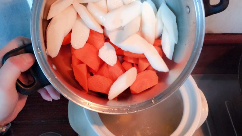 12. 又半小时后,再继续放入山药和胡萝卜。