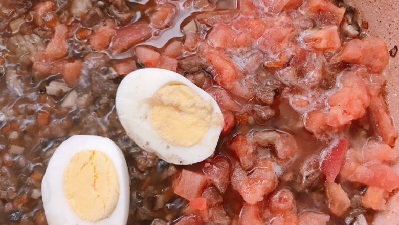 11. 将熟鸡蛋切成两半,在牛肉快煮好时加入;