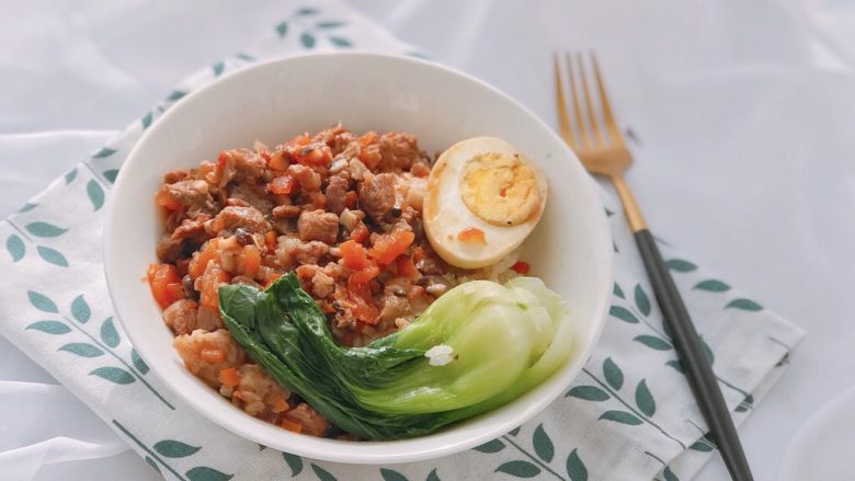 15. 最后盛一碗米饭,上面铺上肉酱,鸡蛋和油菜摆放好,开吃吧。
