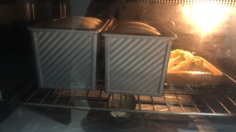 9. 烤箱里放一碗热水,吐司盒放进烤箱,开启发酵功能发酵至模具9分满,加盖吐司八分满即可。
