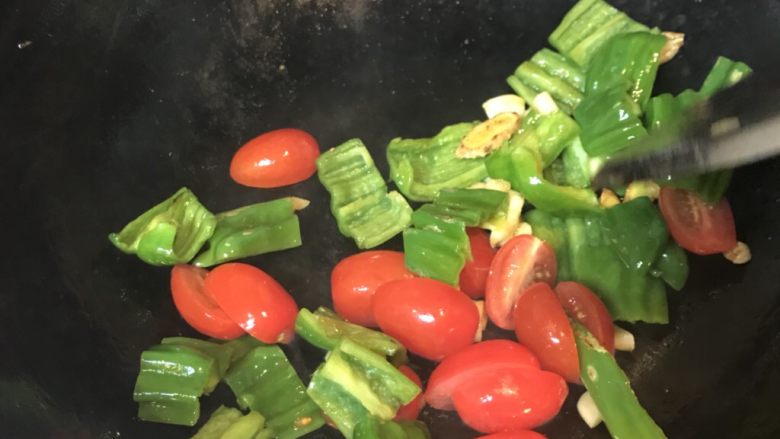 9. 捞出虾,加油,将蒜姜小火炒香后,小火遍香青椒