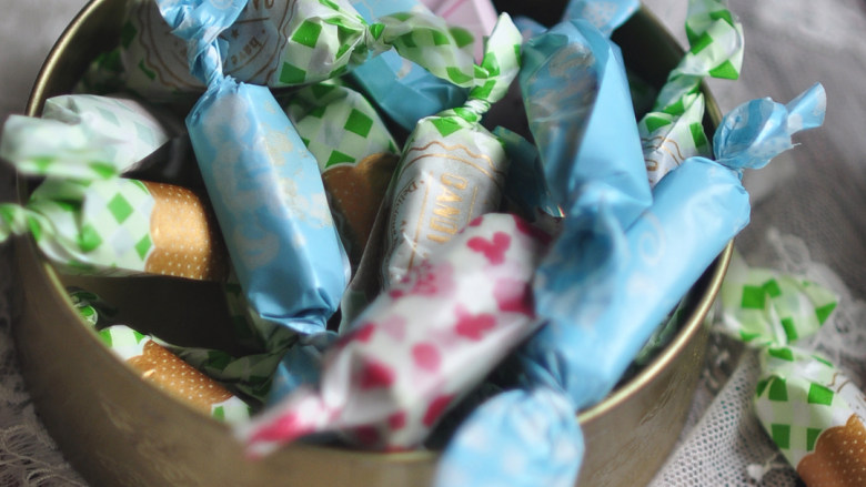 13. 取出做好的牛扎糖放入铺好的油纸上