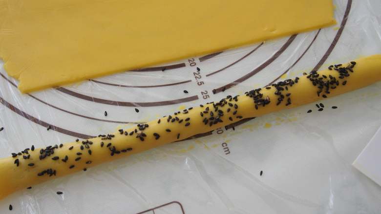 9. 稍微揉一下,让豆沙和面皮贴合更紧密。刷上一层蛋液,撒上一层黑芝麻。