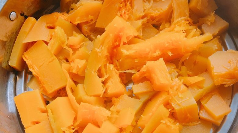 5. 一直炒,把水分炒干,奶香南瓜馅就做好了