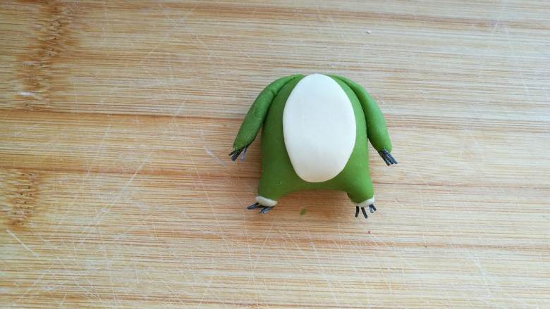 7. 取一小块白色面团搓成椭圆状,擀成椭圆形面片粘到肚皮上。
