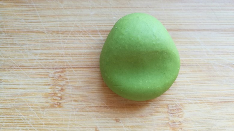 14. 将另一块面团揉匀,捏成上部稍尖的圆形,用手指在下方按压出青蛙立体的脸型。