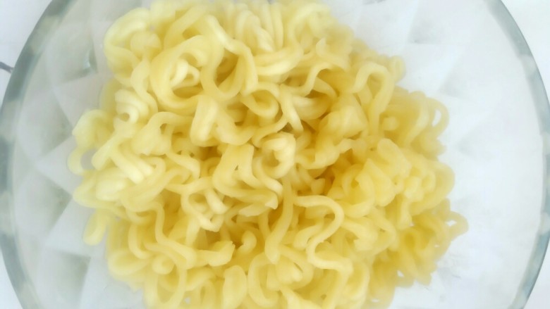 11. 事先准备一碗开水,放凉,将八分熟的泡面放入开水中,冲洗。