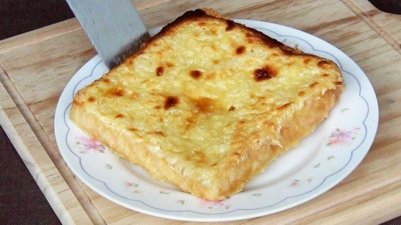 - 吐司面包先烤好,取2公分的厚度,乳酪液浇上去烤一烤,味道就很棒了!