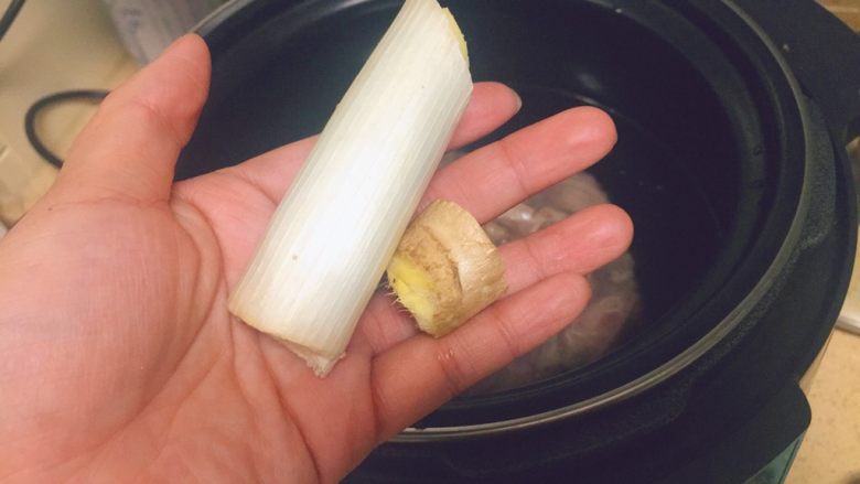 2. 然后把护心肉捞出来,放进高压锅里,锅里加刚好没过肉那么多的水,把准备好的葱段和姜块放进去。如果没有高压锅,用普通锅也是一样的,放的东西都一样。只是用普通锅的话,时间比较长。